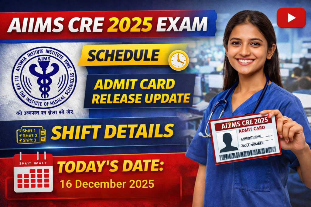 The All India Institute of Medical Sciences (AIIMS), New Delhi has officially released the detailed schedule and important instructions for the Common Recruitment Examination (CRE-4) Computer Based Test (CBT) 2025. The examination will be conducted from 22 December 2025 to 24 December 2025 across multiple shifts for various Group posts.